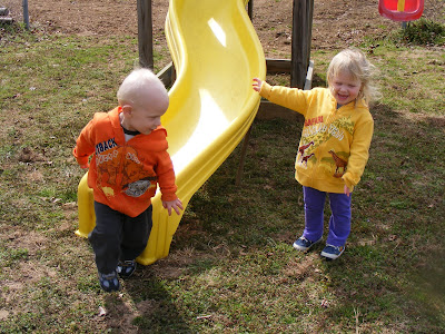 This pic is from earlier today ( their actual birthday). They were playing on their "new" swing-set :) :)